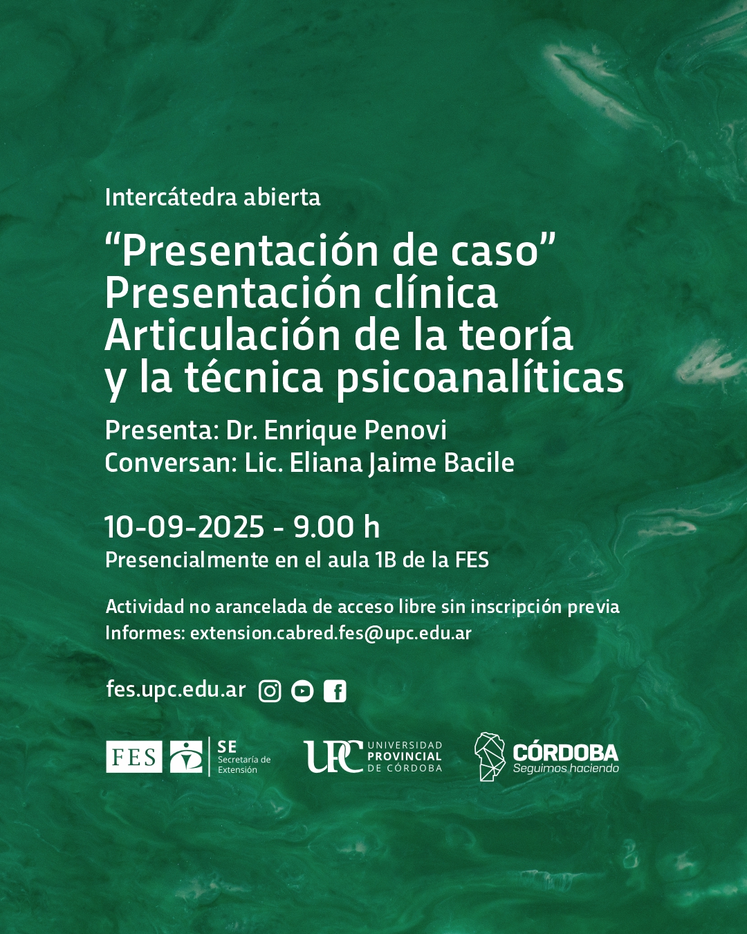 La Secretaría de Extensión de la Facultad de Educación y Salud “Dr. Domingo Cabred” (FES) invita a toda la comunidad a participar de la Intercátedra Abierta: “Presentación de caso”. Presentación clínica. Articulación de la teoría y la técnica psicoanalíticas.