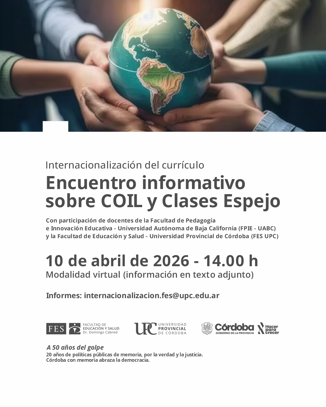 En el marco del convenio de cooperación académica firmado entre la Universidad Autónoma de Baja California (México) y la Universidad Provincial de Córdoba, la Facultad de Educación y Salud Dr. Domingo Cabred (FES) convoca a sus docentes a una instancia informativa sobre modalidades de intercambio académico internacional en formato virtual. La reunión se realizará el jueves 10 de abril de 2026 a las 14:00 horas, en modalidad virtual. El enlace de acceso será remitido automáticamente una vez completado el formulario de inscripción.